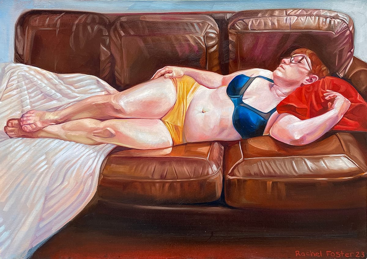 From left: Rachel Curtis, “ASMR,” 2024, oil on canvas, 48 by 40 inches; Rachel Curtis, "Fionn," 2023, oil on canvas, 36 by 30 inches. Images courtesy of the artist.