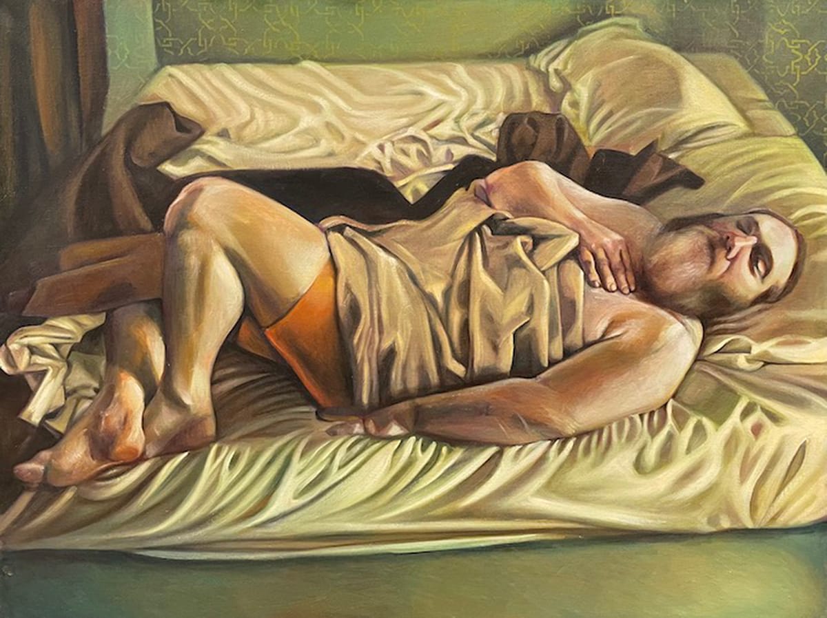 I think it’s worth pausing here to point out how rare and remarkable it is that Curtis reverses the gender dynamics between artist and model familiar to us from art history. This is especially true since she foregrounds her male partner’s role as a parent and caregiver (rather than mainly an object of erotic interest). While the history of 19th and 20th century Western art is chock full of examples of female partners serving as the model-muses of famous male artists,1 the reverse has been unthinkable and invisible for centuries and is still a relative rarity today. To see the wife and mother of a family assert her vision from the position of the invisible observer while her husband and children play the part of muses feels scintillating in the subversive potential it still carries in 2024.