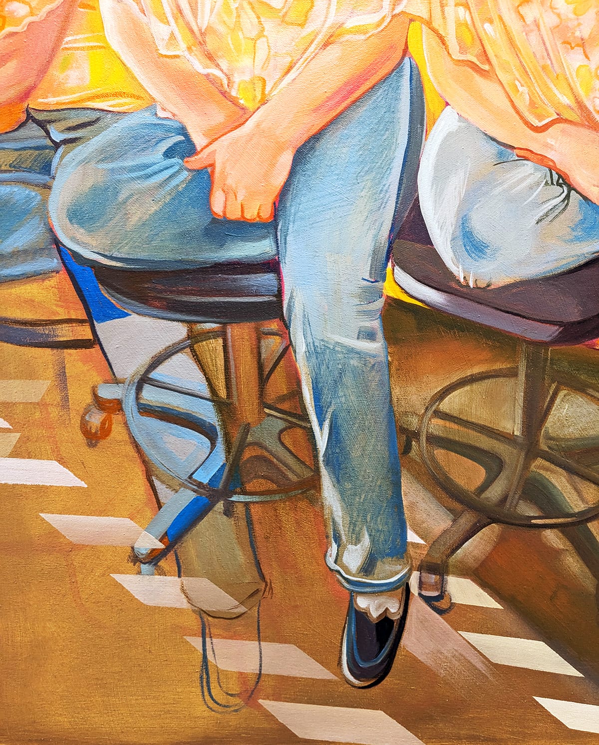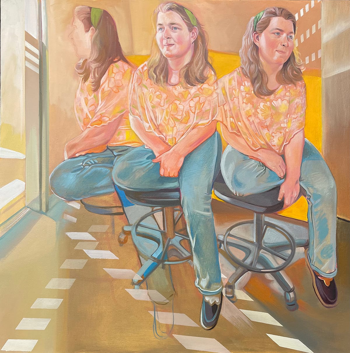 Curtis puts her recently developed technique of painting multiple versions of a single figure in one painting to spectacular use in numerous works in the exhibition "Talk to Me," capturing both the vibrant spirit of her daughters ("Tavi in Orange;" "The Oracle;" "The Oracle 2") and something of the style and creative process of three fellow Wichita artists: Kevin Kelly, John Oehm and Tim Stone. In most of these works, she also utilizes geometric patterns that sometimes partially obscure the figures and sometimes create abstracted backgrounds that transport the figures into a special kind of space.
