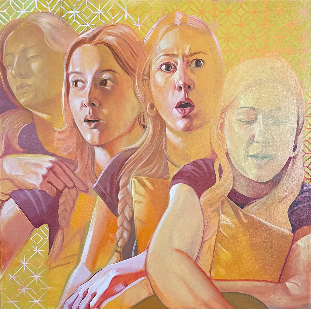 From top left: Rachel Curtis, "Tavi in Orange," 2024, oil on canvas, 34 by 34 inches; Detail of "Tavi in Orange;" Rachel Curtis, "The Oracle 2," 2024, oil on canvas, 36 by 53 inches; Rachel Curtis, "The Oracle," 2024, oil on canvas, 34 by 34 inches. Detail photo by Ksenya Gurshtein for the SHOUT. All other images courtesy of the artist.