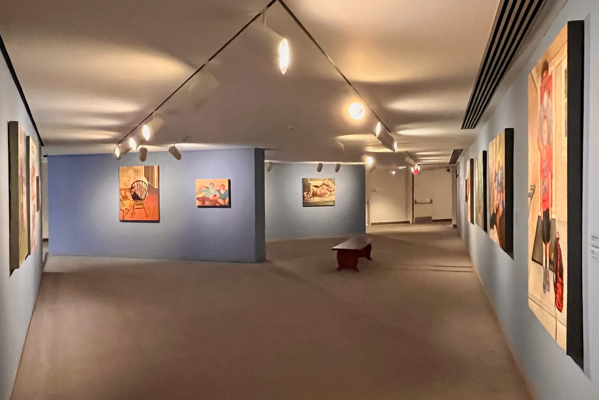 Curtis’ serial way of painting the same subjects offers an object lesson in these challenges. This is particularly evident at WAM, where the artist’s ex-husband, Frank Foster, appears in eleven out of the fourteen paintings on display. He is the protagonist of this show, but despite being pictured so many times, who he is remains largely enigmatic. As viewers, we have to actively piece our image of Frank together, practicing more slowly and with more self-awareness (one hopes) the skills for sizing up strangers that most of us have put on autopilot during childhood.