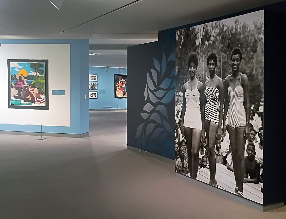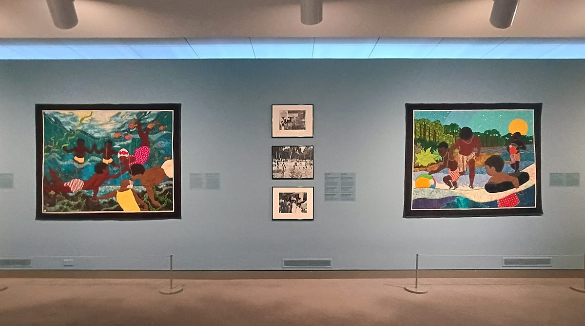 Installation views of the exhibition "Safer Waters: Picturing Black Recreation at Midcentury." Featuring paintings and quilts by artist Stephen Towns, the exhibition is on view in the Ross Ritchie Gallery at the Wichita Art Museum through June 14, 2026. Photos by Jeromiah Taylor for The SHOUT.