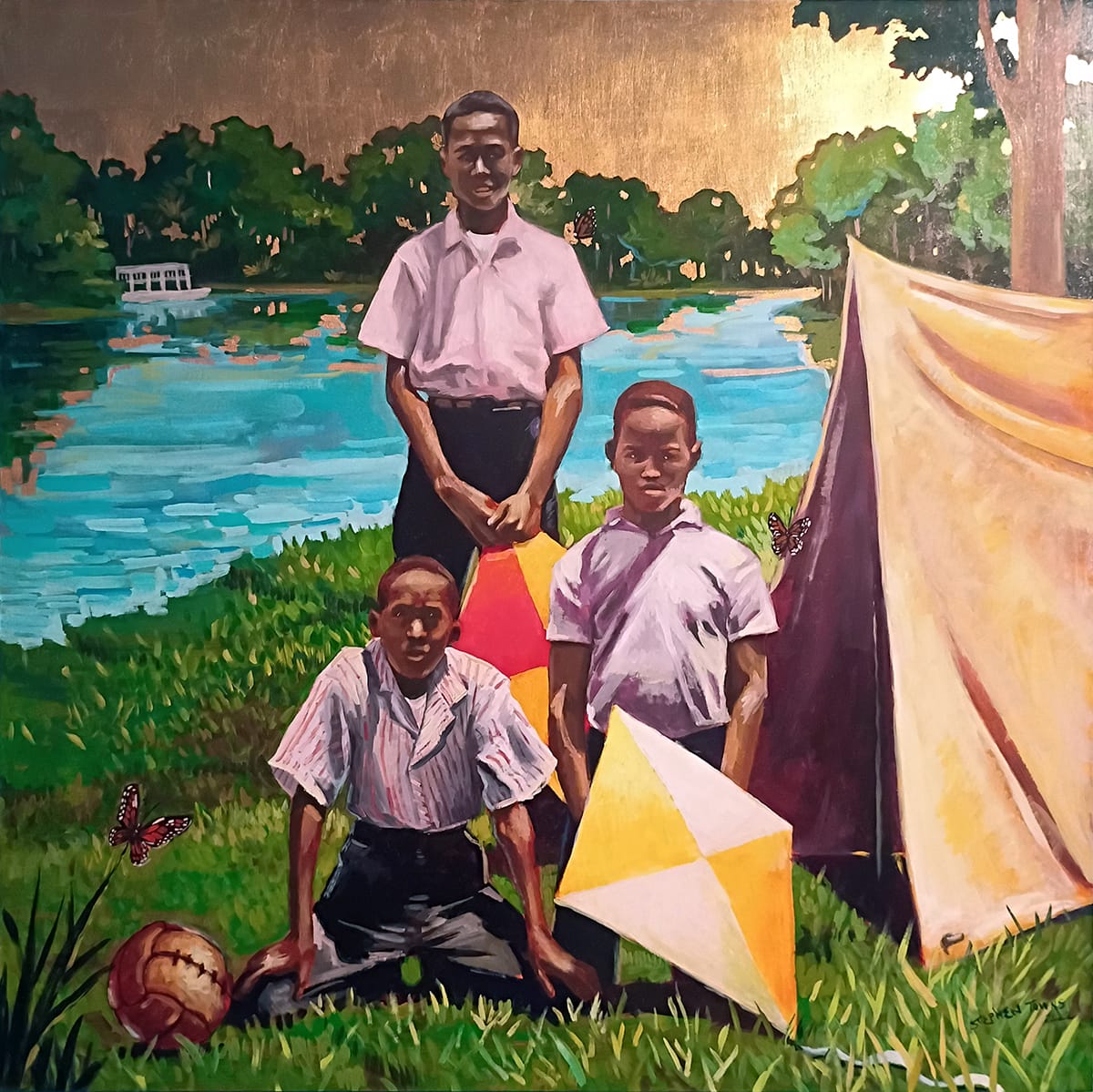 A whole painting, in fact, is called "When We Were." The horizon is entirely coated with gold leaf, and three foregrounded boys once again face us head-on, surrounded by kites, a tent, and a basketball. In the middle-ground is a river on which glides a white boat. In the left corner is a butterfly. Towns freights butterflies with the we-are-ness of his subjects. He likes that they migrate and that, while they tend to drop dead, the group as whole ultimately makes it where it's going. What, then, to make of the butterfly — a disconcerting mix of memento mori and token of hope — floating about three children in a work named "When We Were." Perhaps at least one of them no longer is. But the gold leaf — God — saw it all: the gone-boy's laughter, his awe, his mirth, his delight. John Ruskin reminds us that we have a religious duty to delight — something similar to leisure, whereby we spend attention and time on something which produces nothing, which we enjoy not for its own sake but as an exercise in the sacred right of humanity to exist without use. These boys fulfilled their duty.