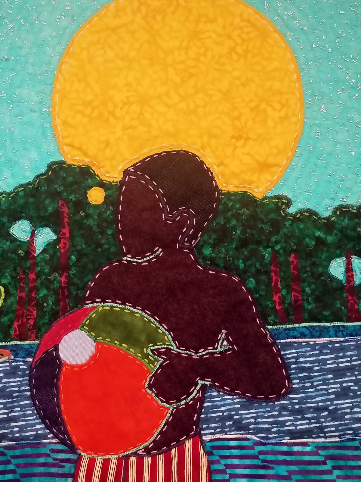 Take, for instance, the quilted work "Luncheon on the Sand." A faceless couple in beachwear confront the viewer and behind them, perched atop a red-and-white striped tent, appears a bird that is backlit by an egg-yolk of a sun. This bird is God. Or, as Towns puts it, a "watcher." A watcher of this couple, "a truth teller, able to tell of this love that they have for each other." In many ways, "Safer Waters" is a prayer, an assured but needy one that says "You saw this, right? You saw what we did, how we kept ourselves human?" The answer in paint and fiber and butterflies and gold and sand and sun and moonshine is "Yes beloved, I saw it all, and I've kept it safe. No one will ever be able to take it away." Towns' every stroke and stitch insist that this happened, this happened, this happened. A manifesto entwined with the show's second refrain: we are, we are, we are.