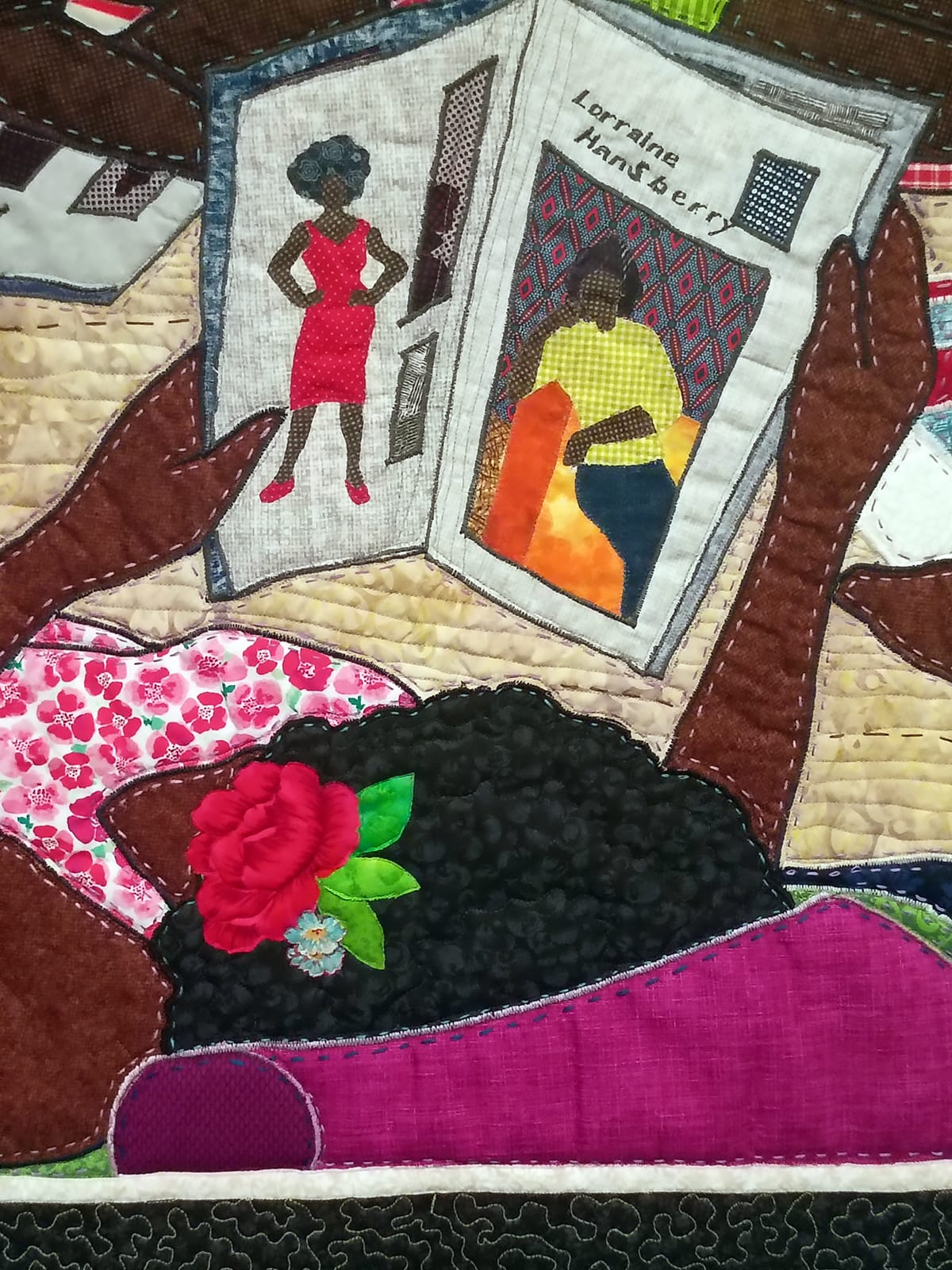 Towns pays attention to the evil vectors of hatred and how they fall unevenly on our bodies. In the quilt "Looking for Lorraine," an homage to Black queer women, and a titular allusion to the Black gay cinematic meditation "Looking for Langston" (1981) by Sir Isaac Julien, we see a group of women sprawled about on the beach. They are relaxed, at places entwined, they have flowers in their hair, and they read serious magazines containing profiles of Lorraine Hansberry. These are women who are not thinking about how they're being perceived. These are women living now as opposed to later. Hansberry's play "A Raisin in the Sun" was titled after a line in Langston Hughes' poem "Harlem":