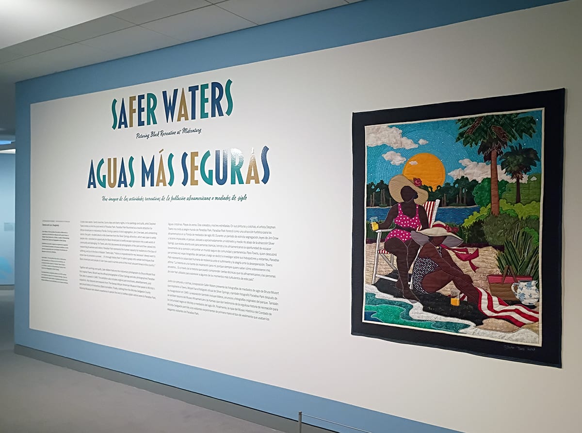 "Safer Waters" revolves around the Florida resort Paradise Park, which during the Jim Crow era of segregation functioned as the Black alternative to the whites-only Silver Springs, now a state park. Both attractions were based around an apparently stunning group of artesian springs along the Silver River in northern Florida. At WAM, Towns' collections of paintings and quilts are placed in conversation with the photographs of Bruce Mozert, who documented the slice of paradise made by and for "colored people," as its sign read during its 1949-1969 tenure. Clothing and other artifacts from both The Kansas African American Museum and the Wichita-Sedgwick County Historical Museum, as well as a short documentary film featuring Towns and former Paradise Park patrons, complete the exhibition.