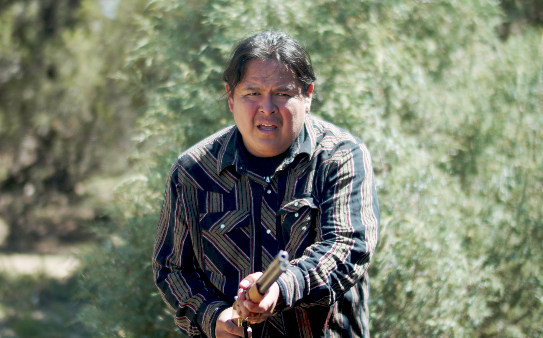 The longest short of the four at twenty-five minutes, “Incident at Juniper Ridge” is in the Diné language (also known as Navajo) with English subtitles. It's the story of siblings (Tilton Tso and Nanabah Rockbridge) who encounter an armed and injured stranger (Evan Littlefish) alone in the mountains. He offers them money in exchange for water, food, and help tending to his wound, but refuses to tell them how he was hurt, or who he's running from — of course, when his pursuers arrive in a beat-up pickup, his secrets put himself and the kids in danger.