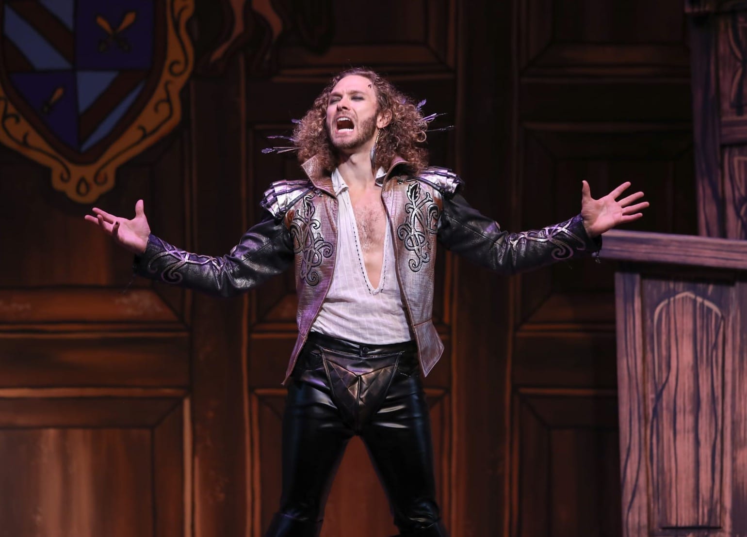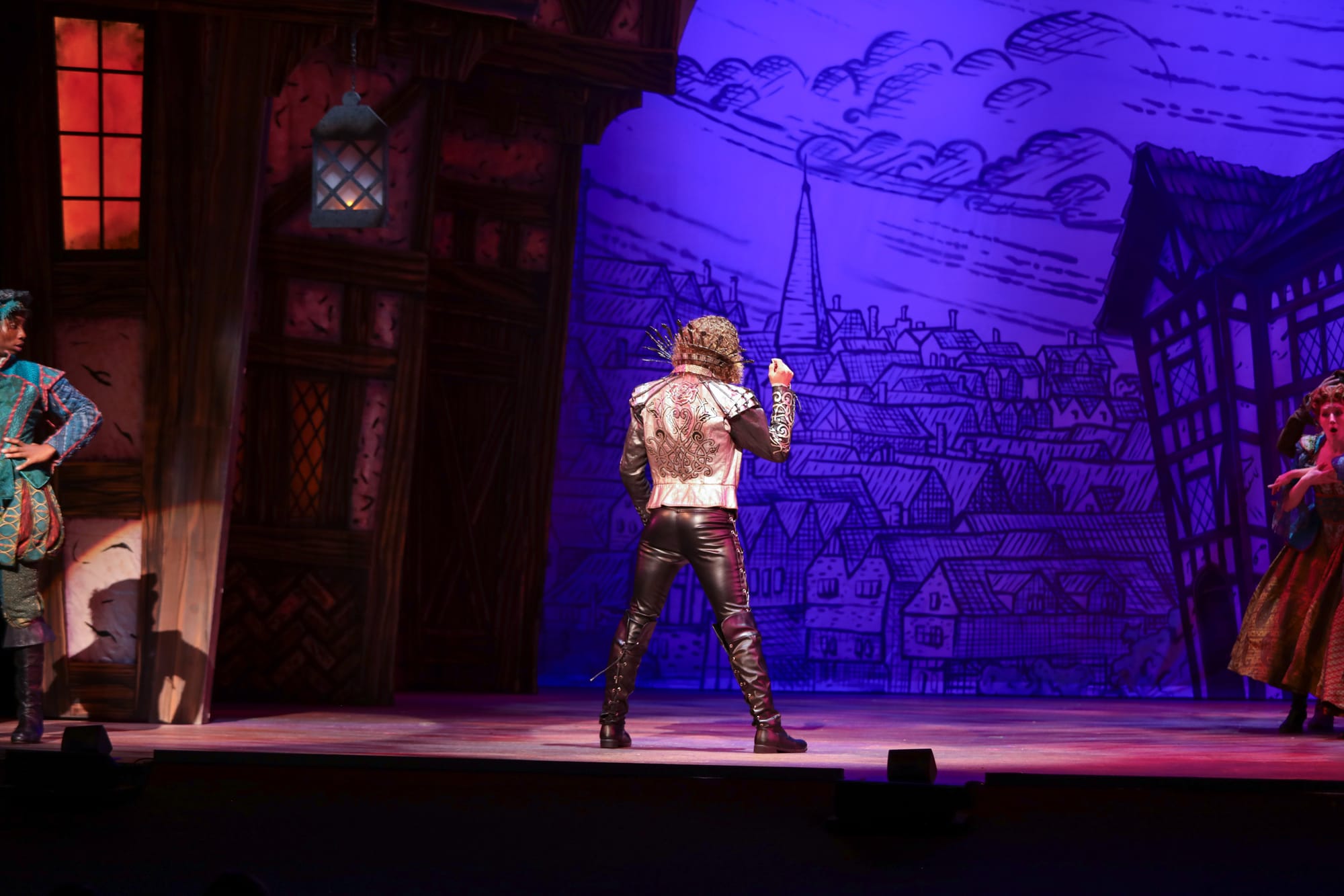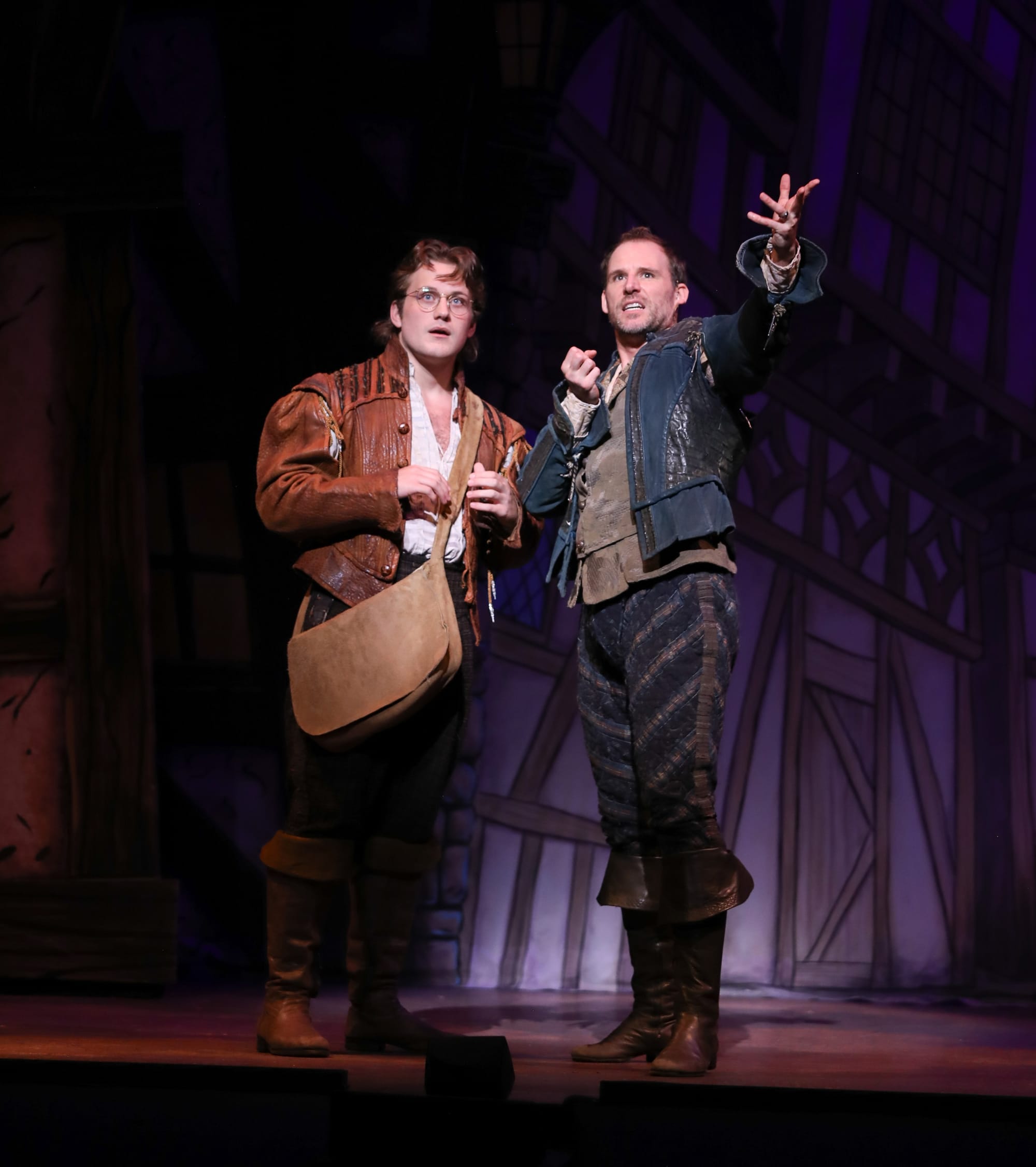 The sets by Jordan Slusher are everything “Something Rotten!” needs, placed as it is in London around 1600. The designer effectively achieves the show’s many locations — including but not limited to a London street, a humble home, a theater we assume is Shakespeare’s Globe, and a courtroom — using 17 stunning handpainted drops. Their illustrative style reflects the lighthearted spirit of this show and reinforces, in an elevated way, the animated nature of this production. Lighting design by Helen Kuukka complements the gorgeous set, making it glow at times in a magnificent way. A seemingly endless parade of bustled and codpieced costumes by Greg Barnes is a whirlwind of colors and textures on the ever-moving cast of actors and dancers. And the wigs! The artistry of Katie Crandall is the perfect crowning touch.