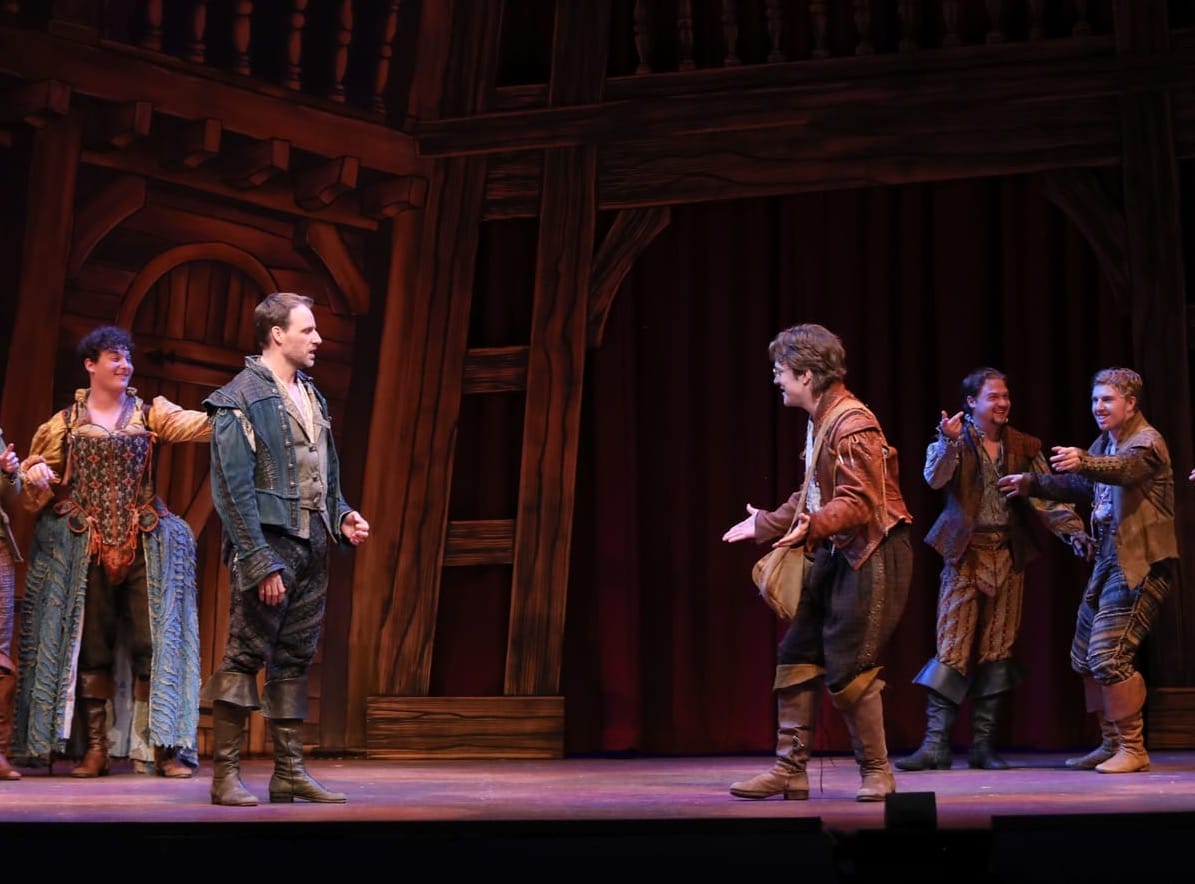 In spite of the fact that this canny show — with book by Karey Kirkpatrick and John O’Farrel, and music and lyrics by Wayne Kirkpatrick and Karey Kirkpatrick — is chock-full of references to the playwright’s famous plays, characters, and lines, one of the first numbers in the show is called, “God I Hate Shakespeare.” This sentiment is expressed by Nick Bottom (Eric Coles) as he debates with his brother, Nigel (Merrick Thoebald Jr.) about whether Will is a poetic genius or a bloviating ass. According to this musical comedy take, they are both right.