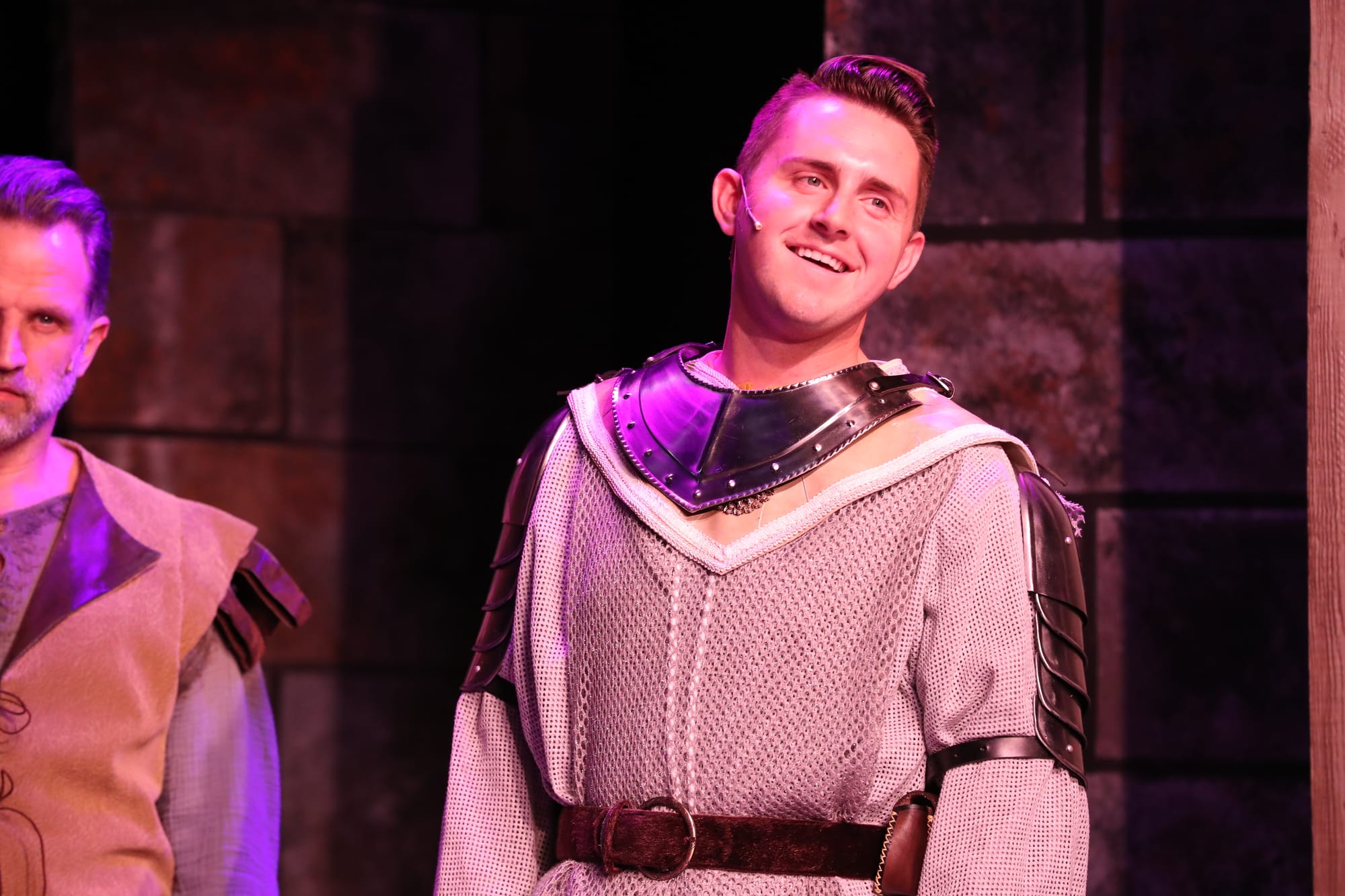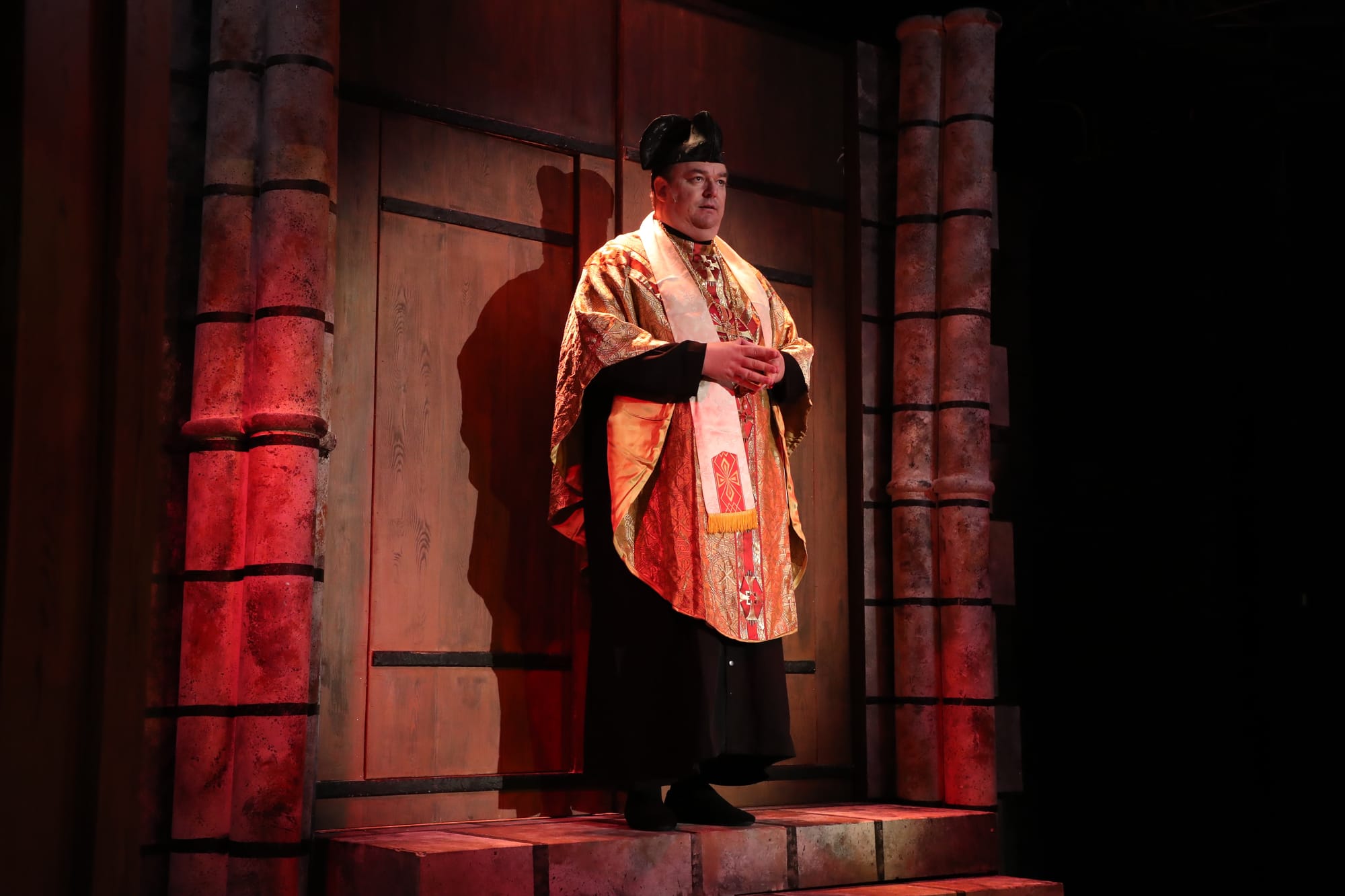 Quasimodo humbly asks Frollo if he can attend the festivities, offering to protect him on the Paris streets, because he is “very strong.” But Frollo tells Quasimodo that he will be shunned if he goes out in public. Frollo, “his master,” explains that the only place he will ever be safe is in his sanctuary. The scene sets the tone for Quasimodo’s plight and Frollo’s villainy. Kyle Vespestad, a well-known and celebrated local comedic actor, is convincing as the straight-faced and serious Frollo. His deep voice and dominating physical presence juxtaposed against Gavin Tanner’s youthful yet hunched posture has a strong visual impact. Tanner’s deft portrayal of Quasimodo befits the complex character who, despite his physical deformities and severe isolation, emerges as a bright light, compassionate and trustworthy and singing his heart out.