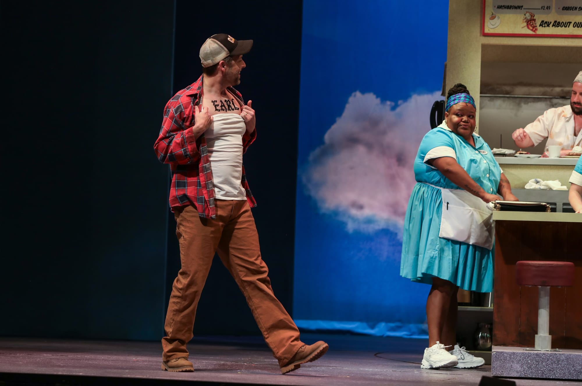 The powerful voice of Kennedy Caughell, as Jenna, well suits the role, particularly with her stunning eleven o’clock number, “She Used to be Mine,” not only vocally fine but hitting every emotional note. Jenna’s fellow waitresses provide ample comedic support through their romantic encounters. Becky, a wisecracking, no-nonsense lady wonderfully played by Injoy Fountain, hooks up with the diner’s short-order cook Cal, played with finesse by John Keckeisen. Dawn, a naïve, gawky girl played by Maggie Spicer Brown, finds equally gawky Ogie, played by Julian Ibarra, through a dating service. Brown and Ibarra mine every ounce of comedy in their roles. Collectively, Fountain, Keckeisen, Brown, and Ibarra provide show-stopping moments.