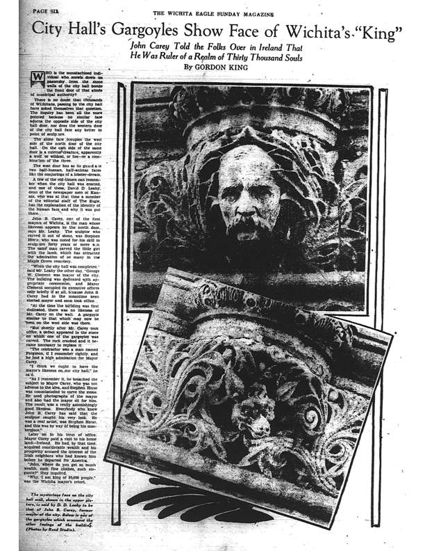 Gargoyle 3 is John B. Carey, one of the first mayors of Wichita. The city hall was built during his term, but the geological immortalization was total happenstance, according to a 1932 Wichita Eagle article. One of the gargoyles cracked shortly after Carey moved in, rendering the rock defective. A contractor suggested that the new face be Carey, who was apparently “not adverse to the idea.”