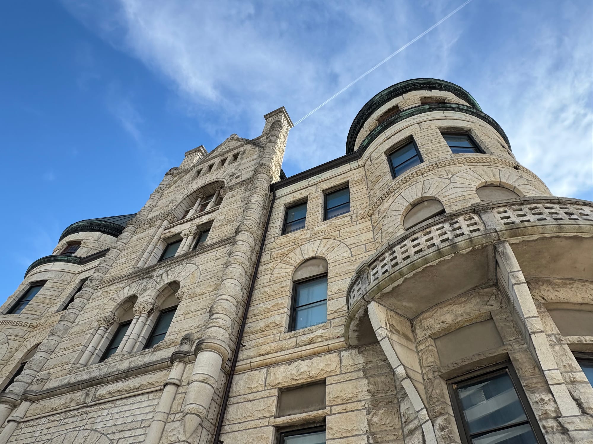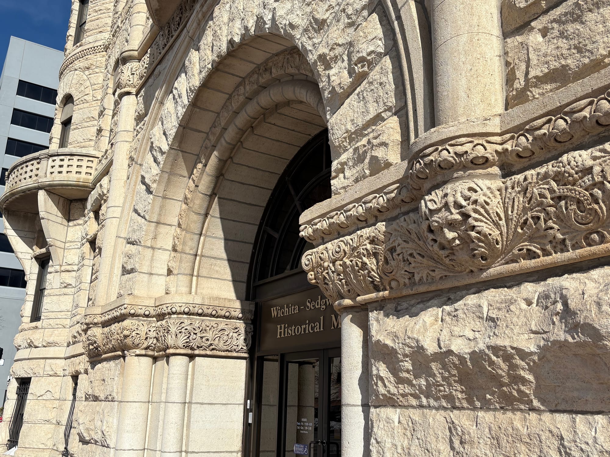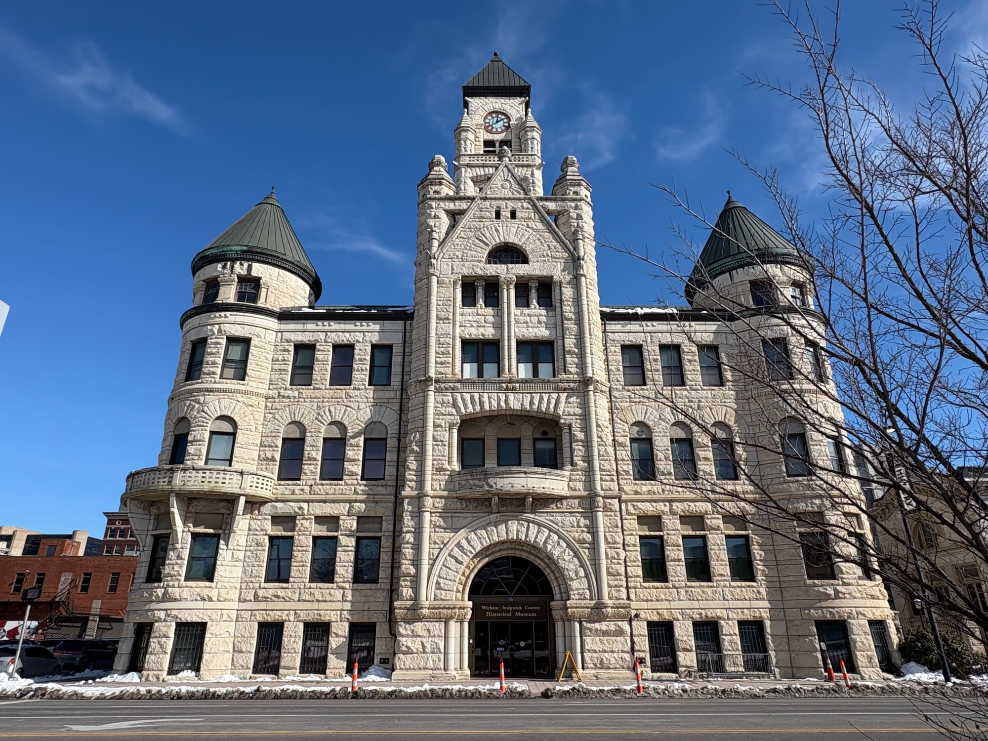 At the corner of Main and William Streets, a structure stands out from its more modern, downtown surroundings: the original city hall, a time capsule of 19th century Wichita. A clock tower sits in the center of this castle-lookalike with conical pillars on each corner.