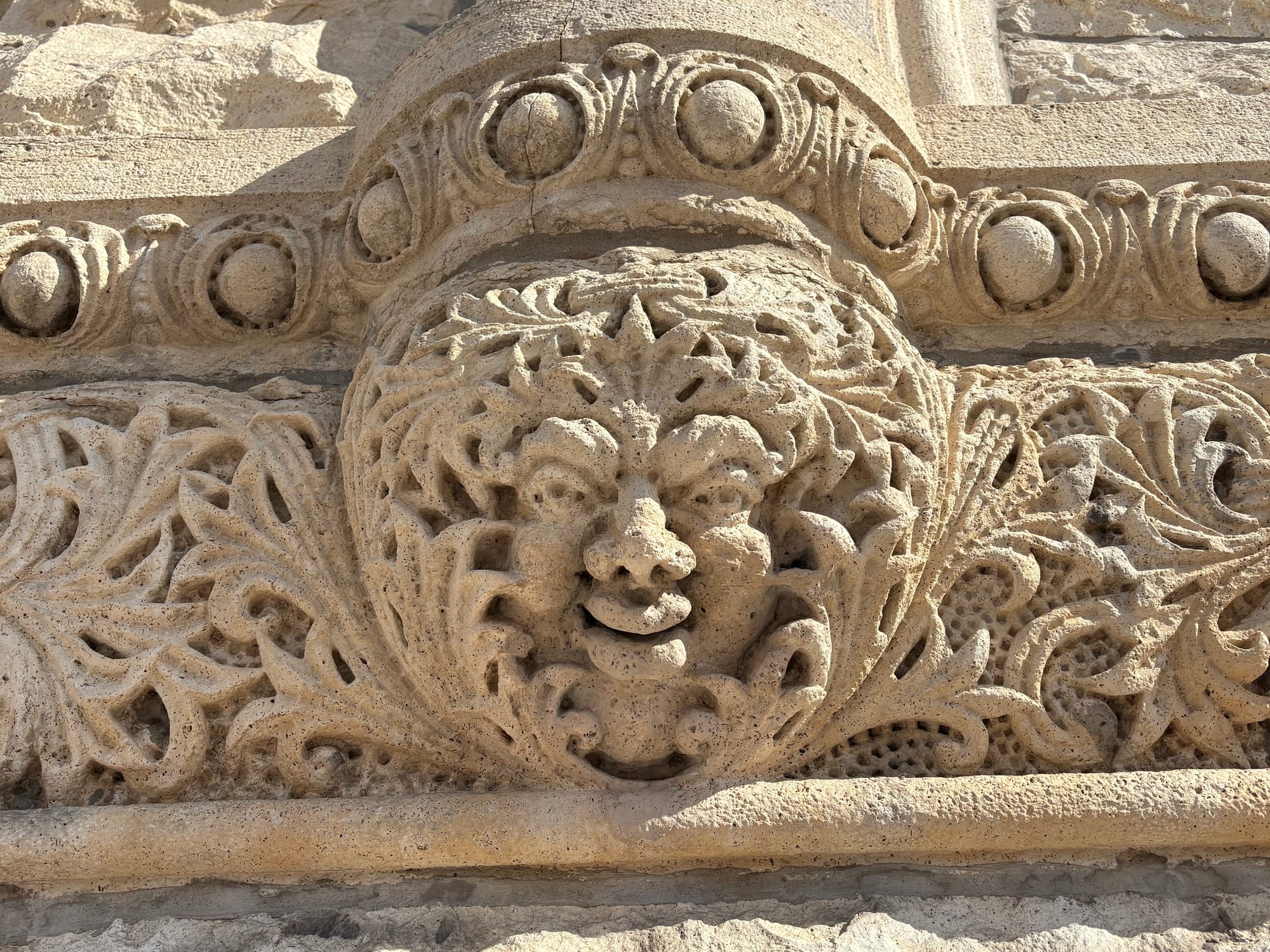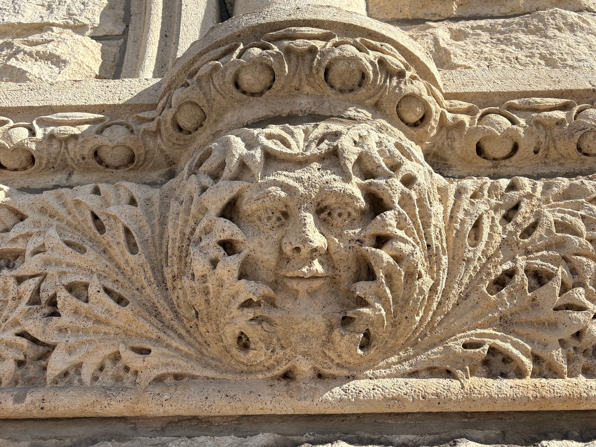 If you look halfway up towards the top of the building, on its east side, you may notice a fifth face carved from limestone peeking out. It has engorged cheeks, a prominent nose, and an expression that lacks amusement, in contrast to the faces of the rest of its family.