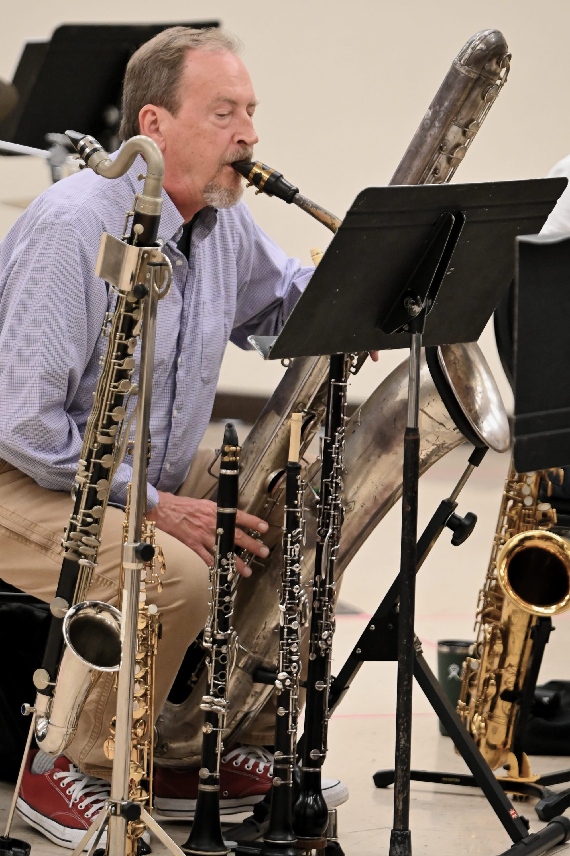 In the WGO production, the orchestra is visible on stage, with conductor William Lumpkin at stage left. Elevated platforms provide playing space behind the orchestra and on a walkway that splits the percussion and rhythm section from the rest of the players.